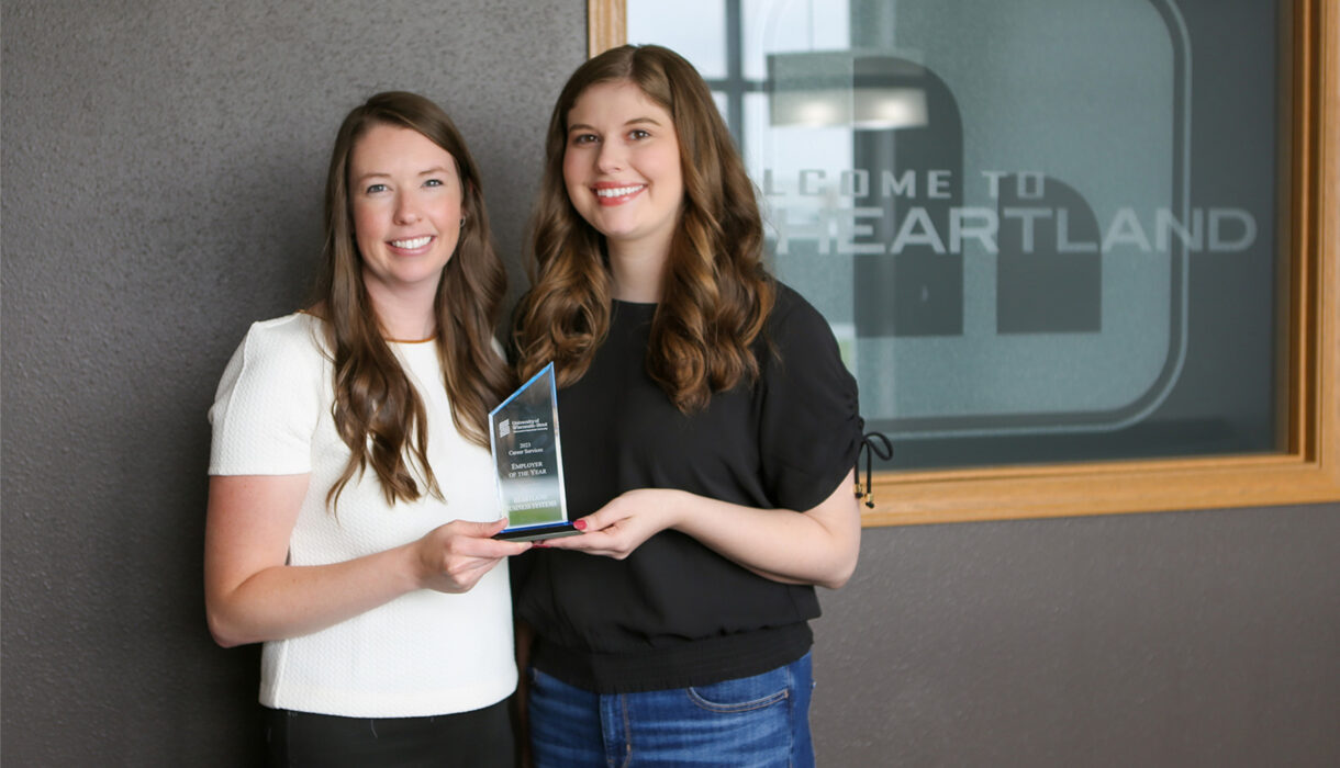 ABOVE PHOTO: HBS college recruiters Kristin Robinson and Abby Vandenberg with the Employer of the Year award. Photos provided by Heartland Business Systems.