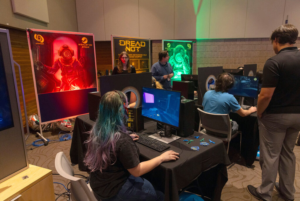 At least 90 M+DEV attendees were either current students, alumni or faculty of UW-Stout. These included two faculty members and three alumni who made presentations and several dozen alumni who exhibited games, including three teams of recent graduates who shared recent capstone projects: Dread Not as well as Tubular!! and Mega Dimension Ripper 9000.