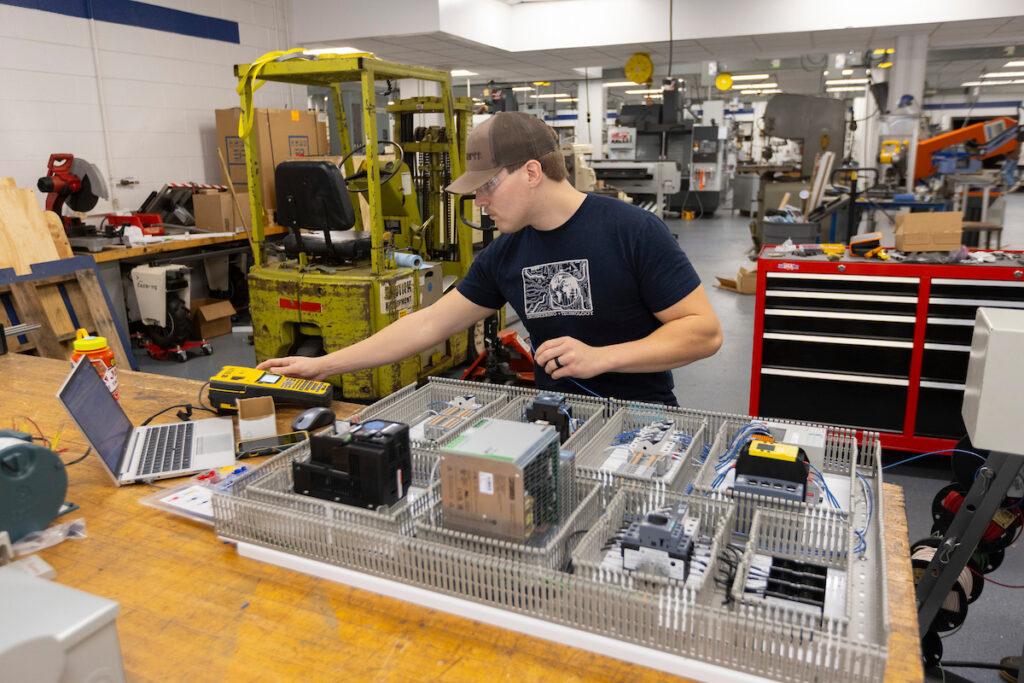 Luke Mertens works on the controls for the Ashley Furniture nonstandard pallet stacker prototype.