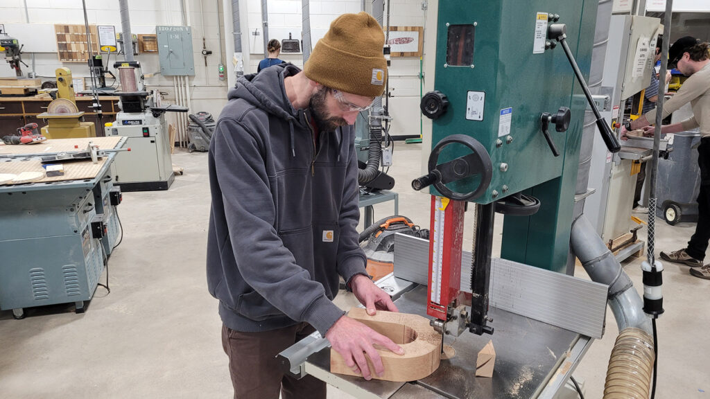 Industrial design student Aaron Burnham makes cuts on his entryway assistant on a band saw in the Process Lab.