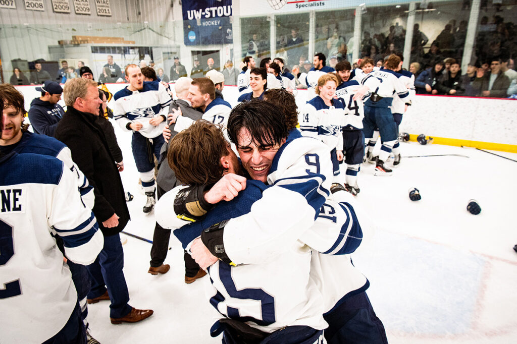 Blue Devils hockey players celebrate the March 7 WIAC Tournament victory that propelled them to the NCAA Tournament. / Photo by Ben Killinger