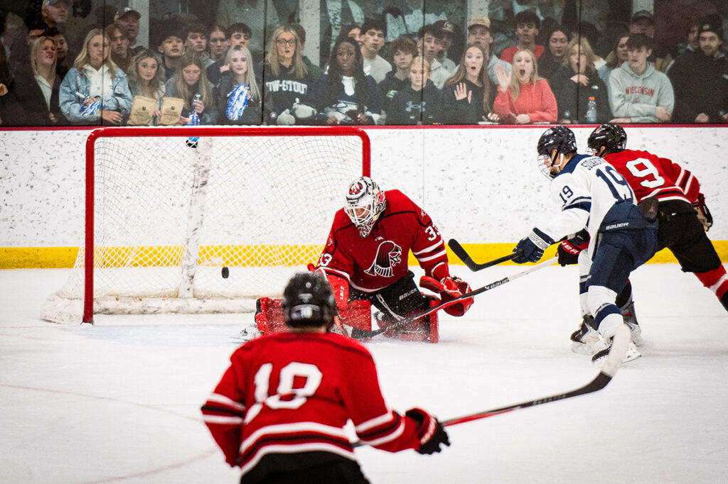Forward Arhip Sidarovich (19) scores against UW-River Falls on March 7. / Photo by Ben Killinger