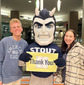 Read MoreABOVE PHOTO: Students Braeden Lange and Maria Winkelman, along with Blaze, the Blue Devil mascot, thank those who supported UW-Stout on Giving Day. The students work for Blue Devil Productions in the Involvement Center on campus. The Stout University Foundation set its sights high for the fifth annual Giving Day at University of Wisconsin-Stout. With a goal of $250,000 — $100,000 more than the previous year’s goal — the Foundation asked members of the university community to step up to support Wisconsin’s