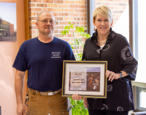 ABOVE PHOTO: Wayne Poppe receives the March University Staff Employee Appreciation award from Chancellor Katherine Frank. / UW-Stout Wayne Poppe has received the University Staff Employee Appreciation award for March at University of Wisconsin-Stout. Poppe, from Menomonie, is a steamfitter with Building Maintenance. He has worked at UW-Stout 27 years. “Wayne’s dedication to UW-Stout can be seen all over our campus…” The person nominating Poppe stated: “Wayne’s dedication to UW-Stout can be seen all over our campus through his many fabrication projects, from keeping